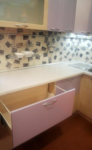 Угловая кухня с большой рабочей поверхностью. Отличный вариант как для городской квартиры, так и для загородного дома. Наличие выкатных ящиков, секций с глихими, стеклянными и поъемными фасадами.