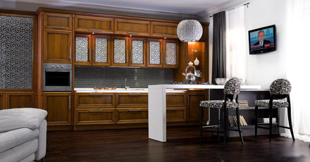 При покупке кухонного гарнитура от 200000 руб. столешница из камня Montelli в подарок! (подробности акции уточняйте в салоне) Другие акции компании смотрите здесь - Кухня «Венеция» Теплый цвет вишни с эффектом искусственного старения фасадов и большой выбор витражей позволяют получить разнообразное стилистическое исполнение гарнитура. Изысканность, правильность форм и ненавязчивая роскошь - это стиль респектабельных людей, уверенных в себе, уважающих традиции. Ведь классика означает не просто пристрастие к выдержанности в интерьере, это и образ жизни, характеризующий человека, который знает, что он хочет получить от жизни. Это стиль настоящих леди и джентельменов.